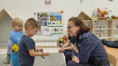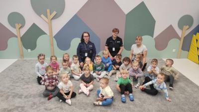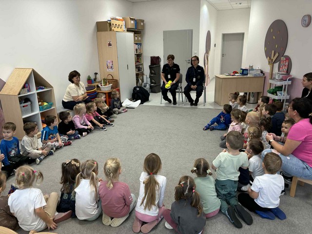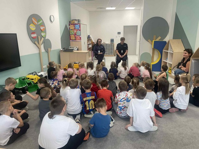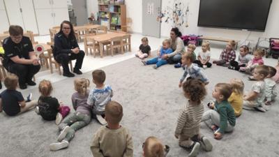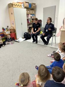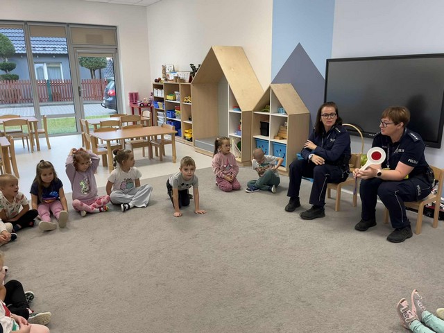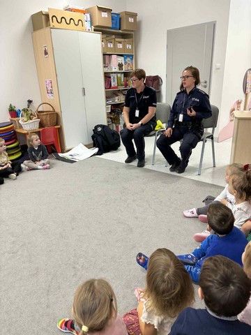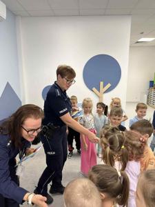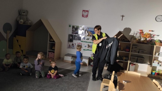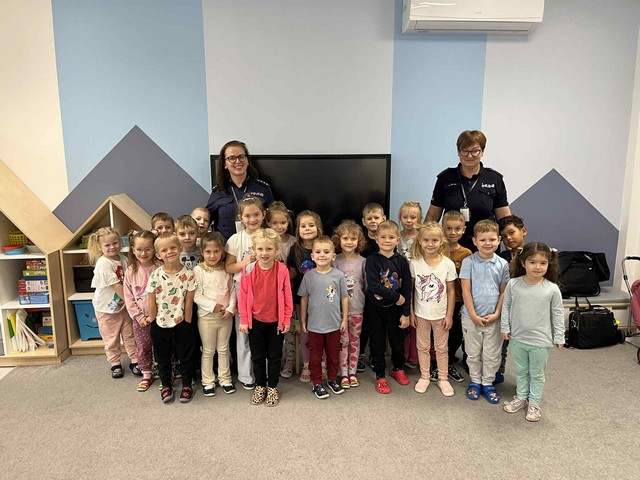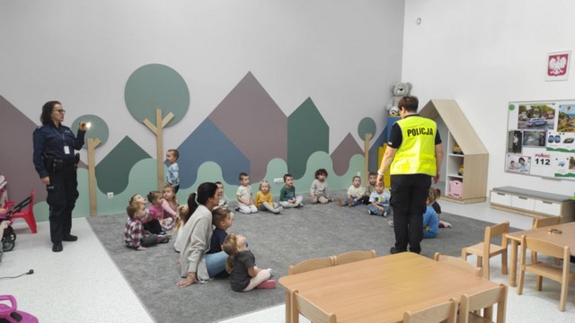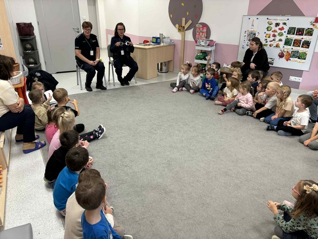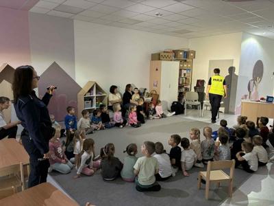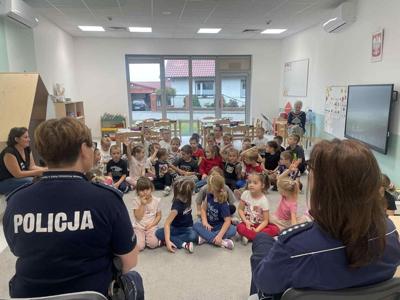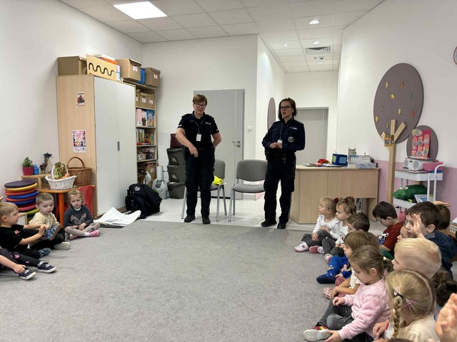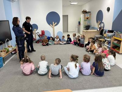Na początku przedszkolaki mogły zapoznać się z zawodem, obowiązkami i atrybutami policjanta. Podczas dalszej części spotkania funkcjonariuszki poruszały zagadnienia związane z bezpieczeństwem na drodze oraz w domu. Przypomniały przedszkolakom, jak ważna jest znajomość numerów alarmowych, swojego imienia, nazwiska oraz adresu zamieszkania.