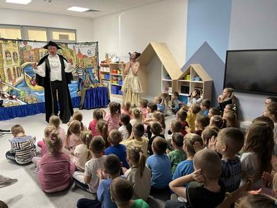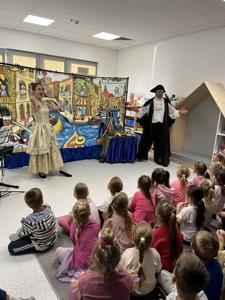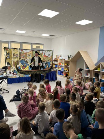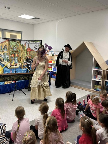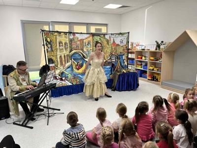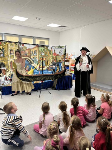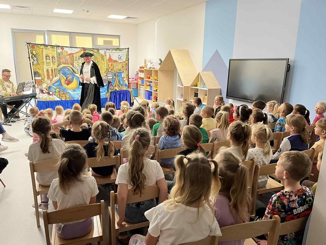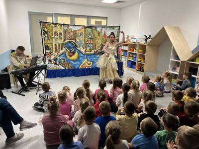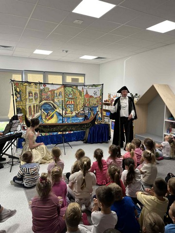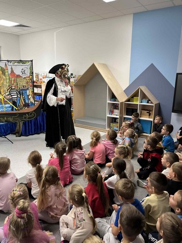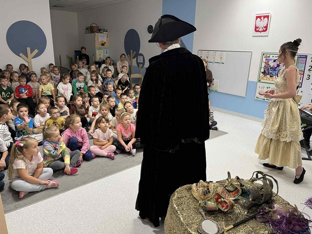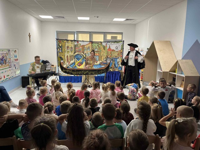 W poniedziałek, 20 października, w naszym przedszkolu ponownie gościliśmy artystów z Filharmonii Pomysłów. Tym razem przedszkolaki z grup „Krasnale”, „Motyle”, „Biedronki” i „Pszczółki” uczestniczyły w przedstawieniu muzycznym „Gondola Maestro Makaroniego”. Podczas spektaklu, wraz z Maestro Makaronim, dzieci wyruszyły w podróż wąskimi kanałami Wenecji, poznając włoską kulturę i język. Przedszkolaki nie kryły zachwytu, słuchając arii operowych śpiewanych przez artystów w języku włoskim. Następnie miały okazję zobaczyć prawdziwe weneckie maski, które zrobiły na nich ogromne wrażenie. Magiczne spotkanie z dźwiękami i muzyką dostarczyło naszym przedszkolakom wiele radości! Zafascynowane występem dzieci nagrodziły artystów gorącymi brawami i z niecierpliwością czekają na kolejne muzyczne spotkanie.