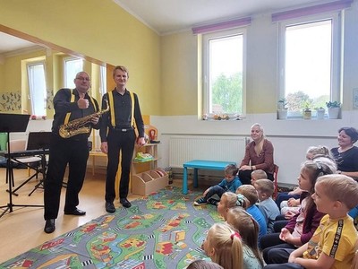 W dniu 6.10 br. nasze przedszkole odwiedzili artyści z Lubuskiego Biura Koncertowego "Orfeusz" z koncertem muzycznym pt. "Wyleciał ptaszek z Łobzowa" z cyklu "W krainie pani muzyki". W czasie spektaklu dzieci poznały nowe instrumenty: sakso