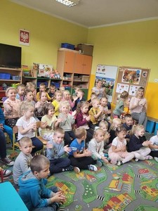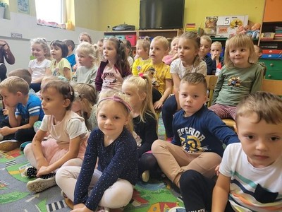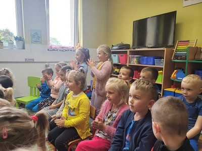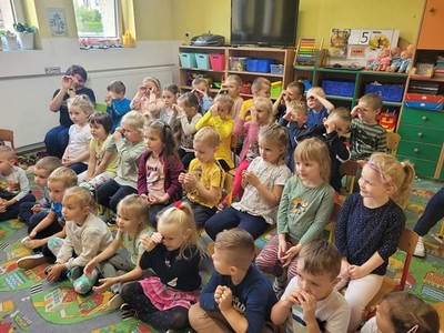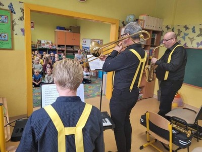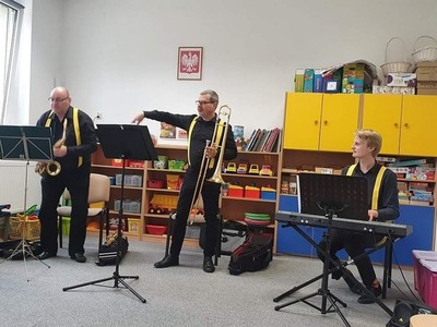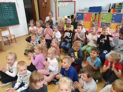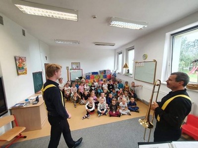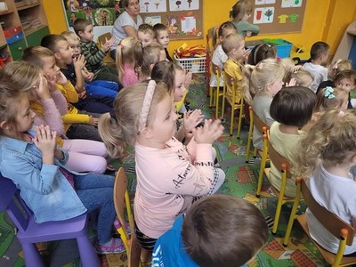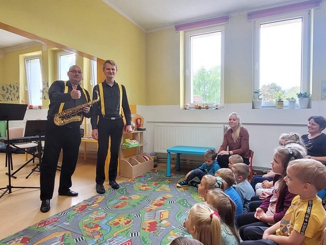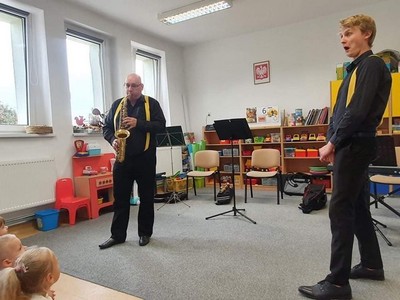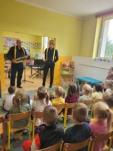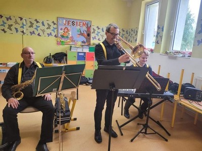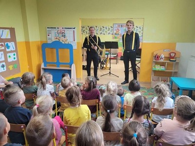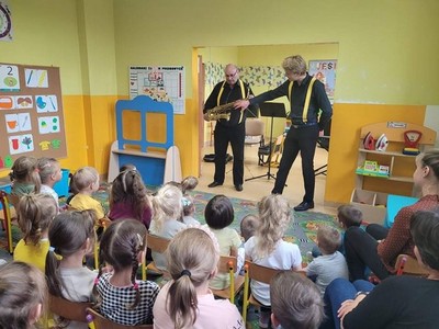 W dniu 6.10 br. nasze przedszkole odwiedzili artyści z Lubuskiego Biura Koncertowego "Orfeusz" z koncertem muzycznym pt. "Wyleciał ptaszek z Łobzowa" z cyklu "W krainie pani muzyki". W czasie spektaklu dzieci poznały nowe instrumenty: saksofon i puzon, a także ich budowę i brzmienie. Przedszkolaki zapoznały się z muzyką charakterystyczną dla okresu młodości ich babć i dziadków. Wspólnie nauczyły się piosenki "Wyleciał ptaszek z Łobzowa".