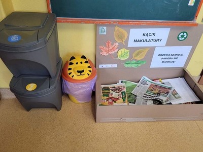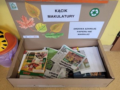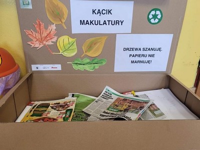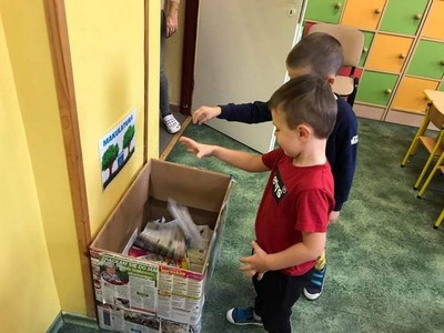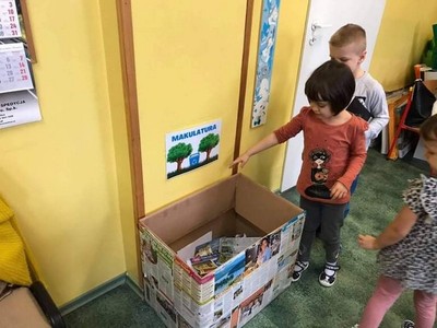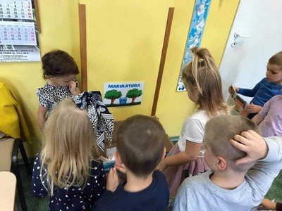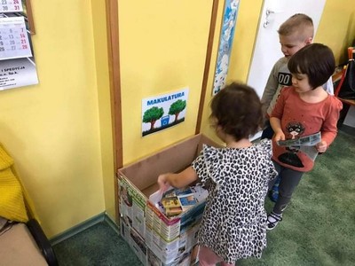 Przedszkolaki wykonały październikowe zadanie projektu "Ekokulturalne przedszkole". W salach powstały "Kąciki makulatury". Dzieci wzięły udział w zabawach i zajęciach poświęconych drzewom. Poznały budowę drzewa, jego znaczenie dla człowieka, zwierząt i całej przyrody. Przedszkolaki dowiedziały się również, jak z drzew powstaje papier potrzebny m.in. do zabaw plastycznych. Postanowiły szanować drzewa, dobrze go wykorzystując. Nasze "kąciki makulatury" obfitują w kartki do rysowania, które są zadrukowane z jednej strony kolorowe ścinki papierów oraz stare gazety, z których dzieci mogą korzystać podczas zabaw dowolnych tworząc barwne prace. W sali znajdują się również odpowiednio oznaczone kosze do segregacji odpadów.