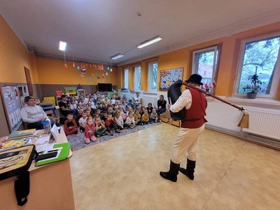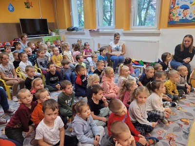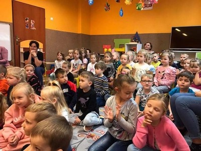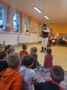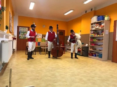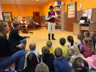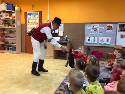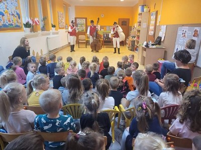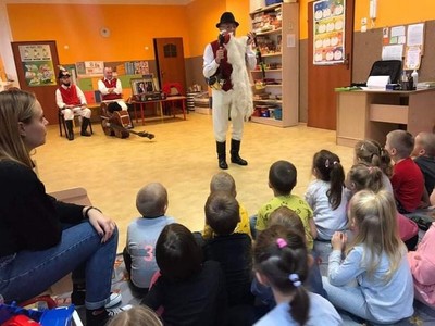 09.11. gościliśmy w naszym przedszkolu artystów z Lubelskiego Biura Koncertowego "Orfeusz". Był to kolejny koncet z cyklu "W Krainie Pani Muzyki" pt. "Nasza koza beczy". Podczas koncertu dzieci poznały: dudy, czarnego kozła ślubnego, weselnego kozła białego, kozła pasterskiego - sierszeńki oraz kontrabas i klarnet. Zapoznały się z ich wyglądem i brzmieniem. Dowiedziały się, kiedy poznane instrumenty były używane. Ponadto przedszkolaki poznały stroje ludowe ziemi wielkopolskiej. Dzieci uważnie słuchały wystąpienia muzyków wtórujących im rytmicznym klaskaniem.