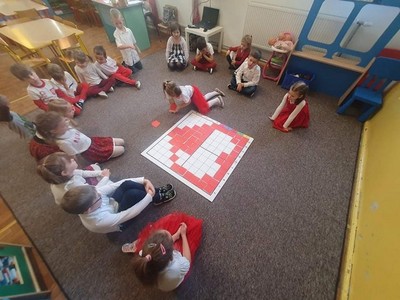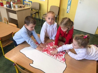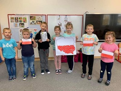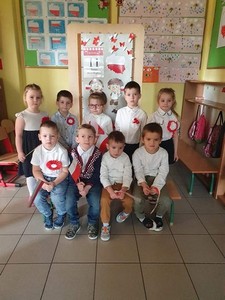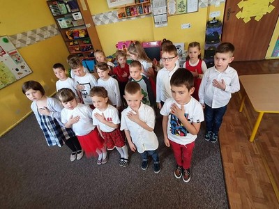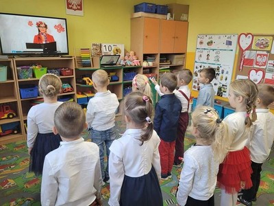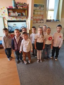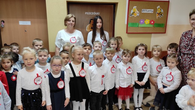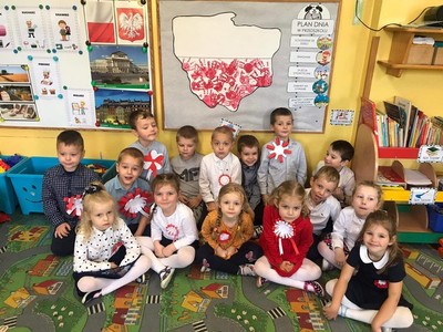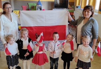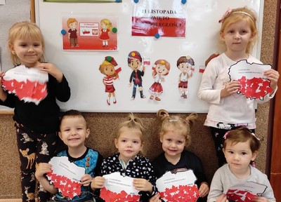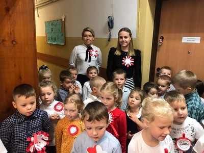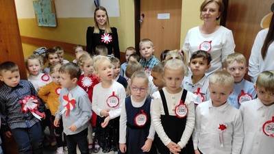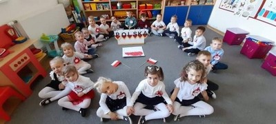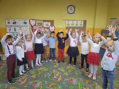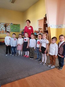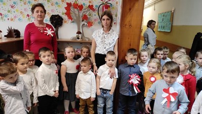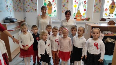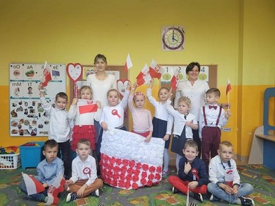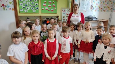 10 listopada obchodziliśmy w naszym przedszkolu Narodowe Święto Niepodległości. Przedszkolaki obejrzały koncert patriotyczny w wykonaniu pani Patrycji Lipińskiej aktywnie w nim uczestnicząc. O godz. 1111 dzieci z wszystkich grup włączyły się w akcję „Szkoła do Hymnu”, dumnie odśpiewały hymn Polski „Mazurek Dąbrowskiego”. Głównym celem zajęć było kształtowanie miłości i przywiązania do naszej ojczyzny, jej kultury i tradycji, rozbudzanie i pogłębianie postaw patriotycznych, oddanie hołdu walczącym za naszą Ojczyznę oraz poznanie symboli narodowych i pieśni patriotycznych. Mamy nadzieję, że celebrowanie tego święta zapadnie w pamięci naszych Małych Polaków, a kiełkujący patriotyzm zaowocuje w przyszłości wzorową postawą dojrzałego i odpowiedzialnego obywatela.