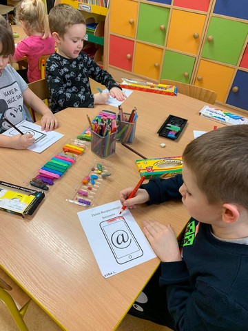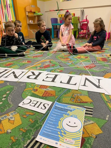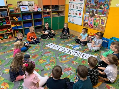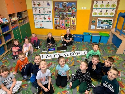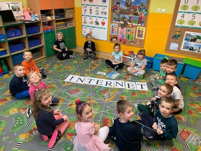 Obchody DBI 2022 8 lutego ogłoszony został Dniem Bezpiecznego Internetu 2022r. DBI ma na celu inicjowanie i propagowanie działań na rzecz bezpiecznego oraz świadomego dostępu dzieci i młodzieży do zasobów internetowych. Jego zadaniem jest również zapoznanie z problematyką bezpieczeństwa online oraz promocja pozytywnego korzystania z sieci. W tym dniu dzieci w naszym przedszkolu poznały urządzenia, dzięki którym możemy połączyć się z Internetem. Ułożyły z rozsypani literowej napis - INTERNET. Następnie dzięki włóczkowej sieci próbowały zrozumieć czym jest sam Internet tzw. SIEĆ. Obejrzana bajka z serii „Owce w sieci” – „Bez kożuszka” i „Tajemniczy przyjaciel” oraz gry edukacyjne stały się początkiem do rozmowy na temat czyhających w sieci niebezpieczeństw, a wysłuchana opowieść o misiu do stworzenia trzech złotych zasad bezpiecznego korzystania z komputera i Internetu. Swoje przeżycia z zajęć dzieci odzwierciedliły w formie plastycznej.