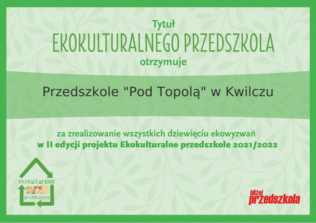 Mi艂o nam poinformowa膰 Pa艅stwa, 偶e nasze przedszkole uzyska艂o tytu艂 EKOKULTURALNEGO PRZEDSZKOLA. W tym roku szkolnym zwi膮zku z realizacj膮 g艂ównego kierunku pracy "Przedszkolak ma艂ym ekologiem" nasza placówka przyst膮pi艂a do II edycji projektu
