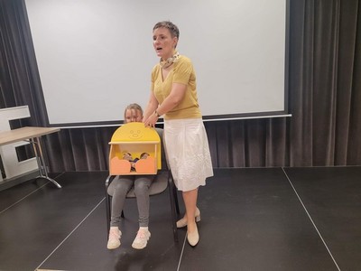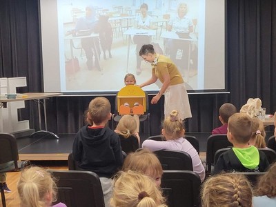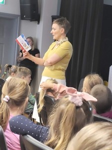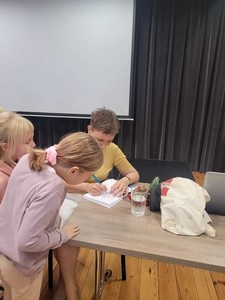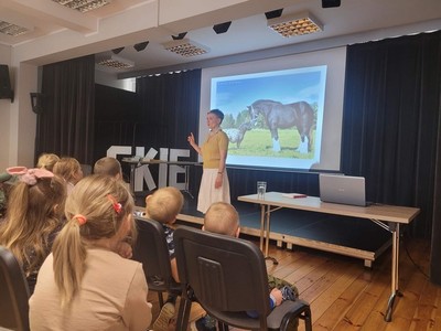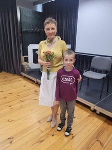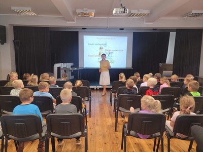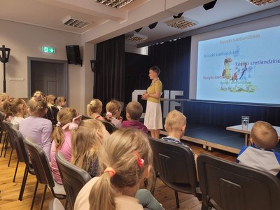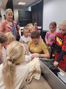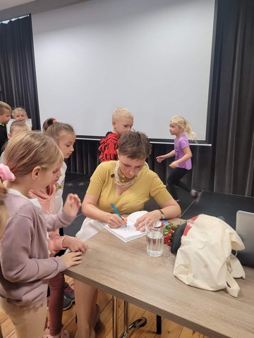 W dniu 14.09 br. dzieci z grupy "Motyle" wybrały się do KCKiE na spotkanie z panią Magdaleną Zarębsą, autorką książek dla dzieci, młodzieży i dorosłych, scenarzystką spektakli teatralnych. Pisarka opowiadała o swoich książkach i ich bohaterach. Następnie za sprawą głównego bohatera książki pt. „Borys i Zajączki” dzieci przeniosły się w świat kucyków. Dzięki prezentacji multimedialnej poznały ich rasy i upodobania. Dowiedziały się, jak mogą służyć człowiekowi. Przy pomocy magicznego pudełka, posługując się zmysłem dotyku, odgadywały nazwy różnych przedmiotów zwiazanych z kucykami. Przebojem była zabawa ruchowa "Wyscigi". W bardzo ciekawy sposób autorka przedstawiła drogę powstania książki, nad którą oprócz pisarza trudzi się wiele osób, by w końcu mogła trafić do czytelnika. Na koniec dzieci zadawały ciekawe pytania, na które Pani Magda udzielała wyczerpujących odpowiedzi. Spotkanie przebiegało w miłej atmosferze. "Motylki" wzbogaciły swoją przedszkolną biblioteczkę o nową książkę z autografem pani Magdaleny Zarębskiej.