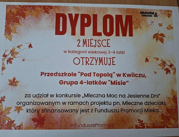 Bardzo miło nam ogłosić, że przedszkolaki z grupy „Misie” zajęły II miejsce w konkursie plastycznym „Mleczna Moc na Jesienne Dni”, organizowanym w ramach projektu „Mleczne Dzieciaki”. Przedszkolaki przygotowały pracę plastyczną przedstawiającą, jak mleko pomaga być silnym i zdrowym podczas chłodnej, jesiennej aury. Projekt jest sfinansowany z Funduszu Promocji Mleka.